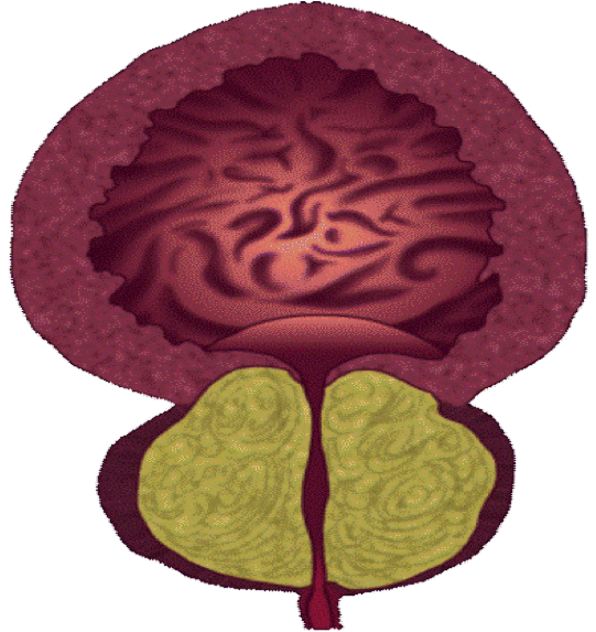 When the prostate enlarges the urethra channel is narrowed by the growing tissue. The narrowing makes urination slower and more difficult to empty the bladder. The bladder responds to the obstruction. The bladder can either stretch to accommodate the poor emptying or, as pictured here, hypertrophy and become stronger to ensure emptying.